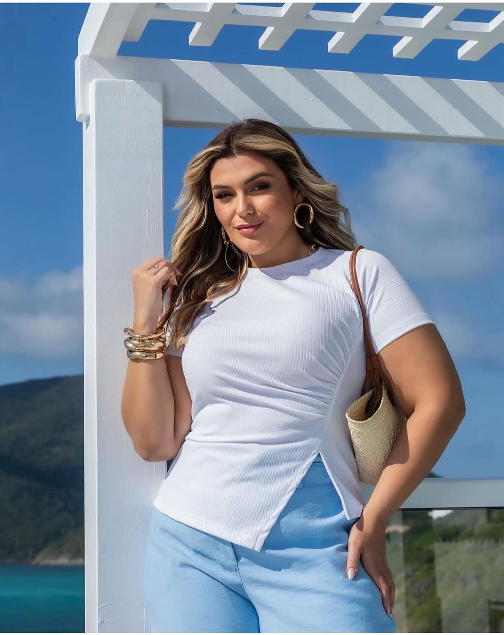 • Possui mangas curtas e gola redonda. O diferencial está no detalhe franzido lateral que modela sutilmente a cintura e na barra com fenda/assimetria, que confere estilo e movimento à peça.