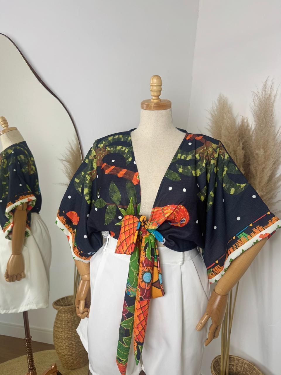 Cheio de frescor e estilo, este cropped é perfeito para compor looks leves e vibrantes. Com modelagem soltinha, mangas amplas e amarração frontal, garante conforto e versatilidade, podendo ser ajustado conforme o corpo.