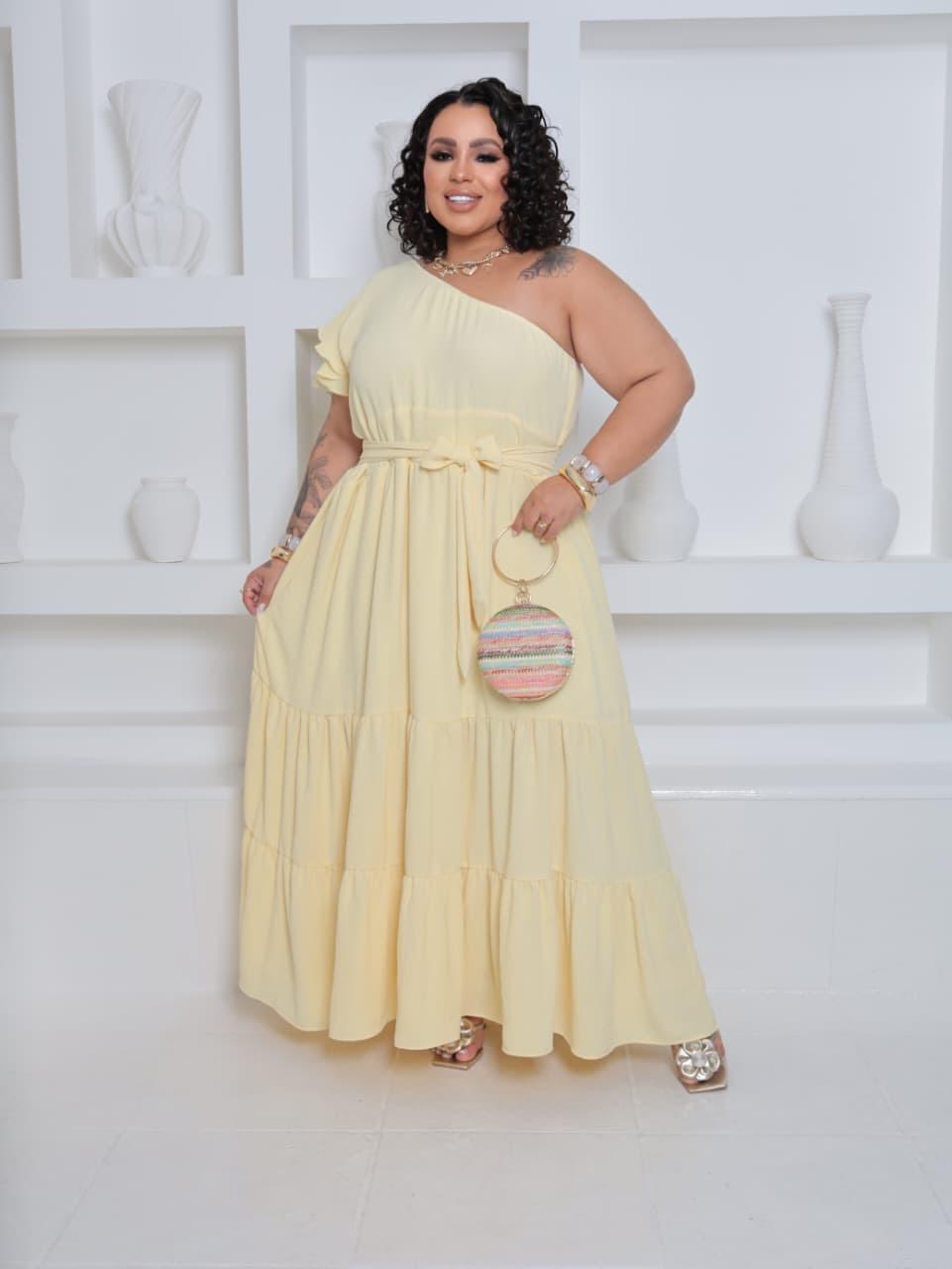 Vestido plus size de tecido leve apresenta decote ombro único e é acinturado com uma faixa que permite ajuste perfeito. A saia longa em recortes de babados confere um caimento leve.